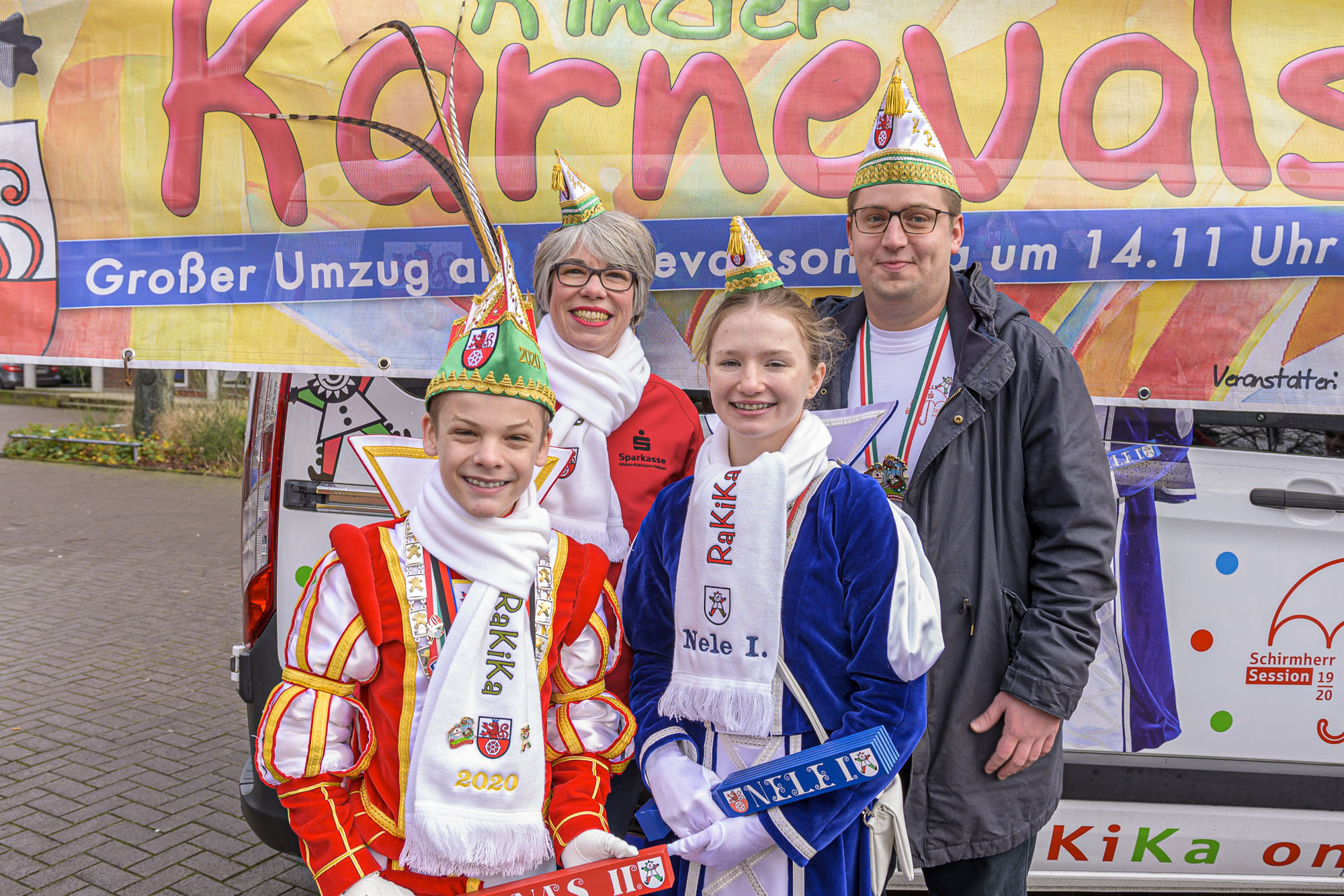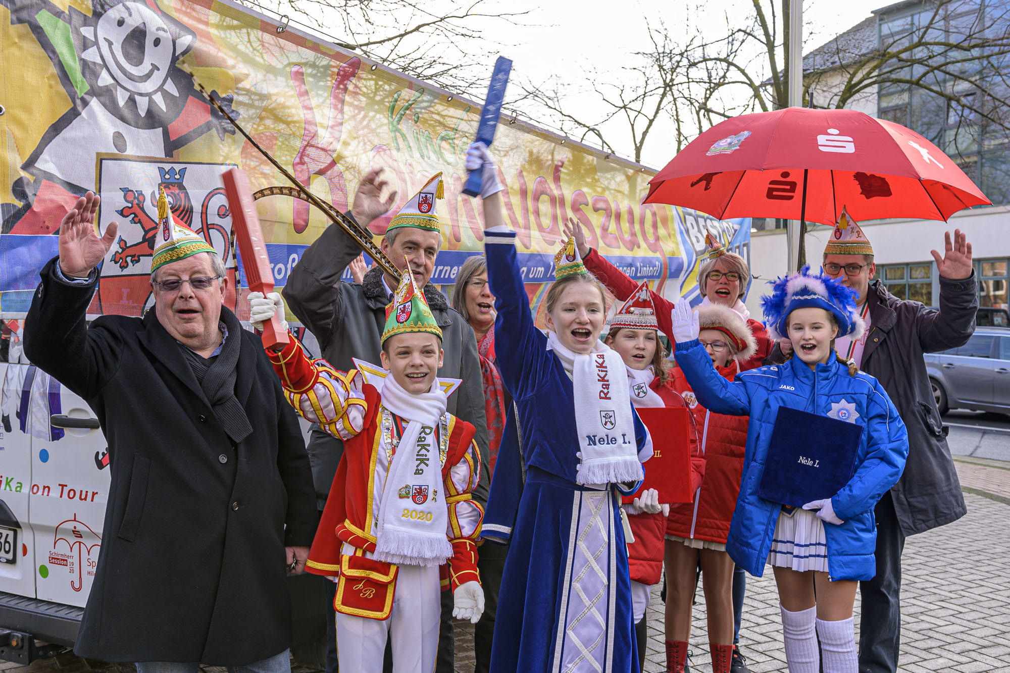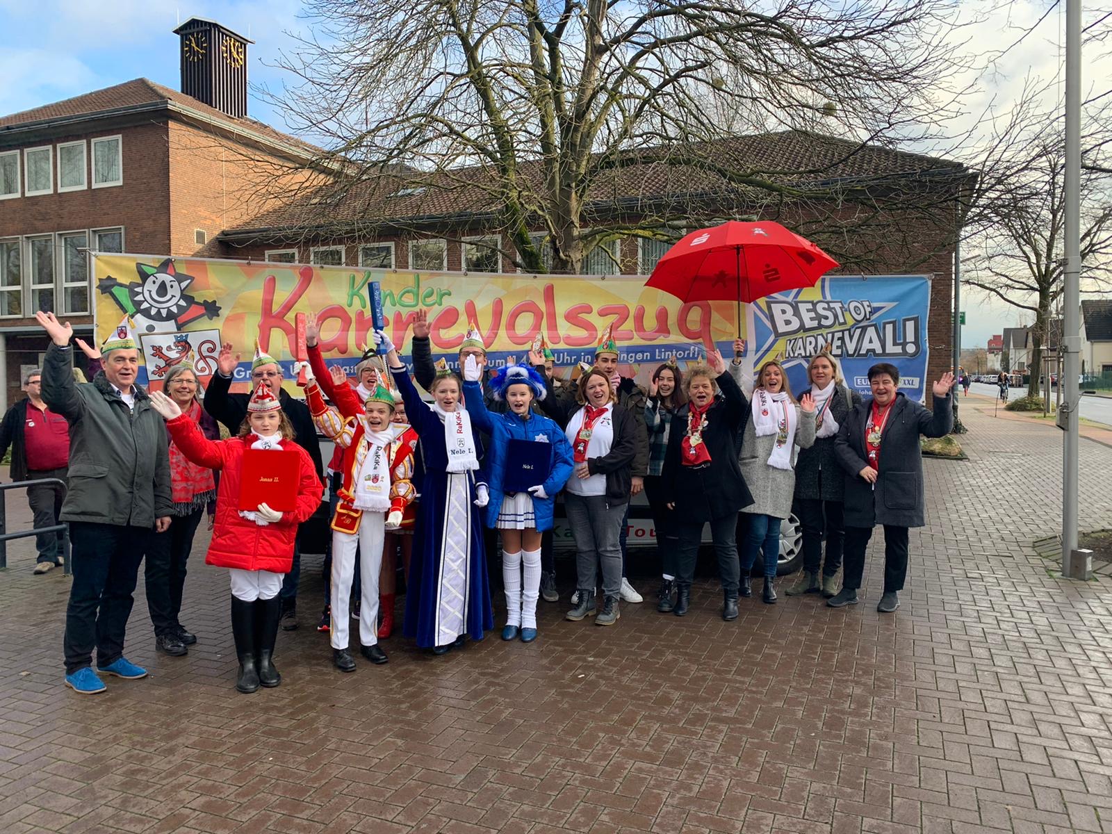 Unsere Kindertollitäten 2020 der Stadt Ratingen, Jonas II. und Nele I. hängten traditionell, wie in jedem Jahr, das RaKiKa-Banner zum Lintorfer Kinderkarnevalszug vor dem alten Rathaus an der Speestraße in Lintorf auf. Begleitet wurden sie von ihren Schirmherren, der Sparkasse HRV vertreten durch Claudia Pocha und Kurt Ehrkamp, sowie von ihrem restlichen Gefolge.